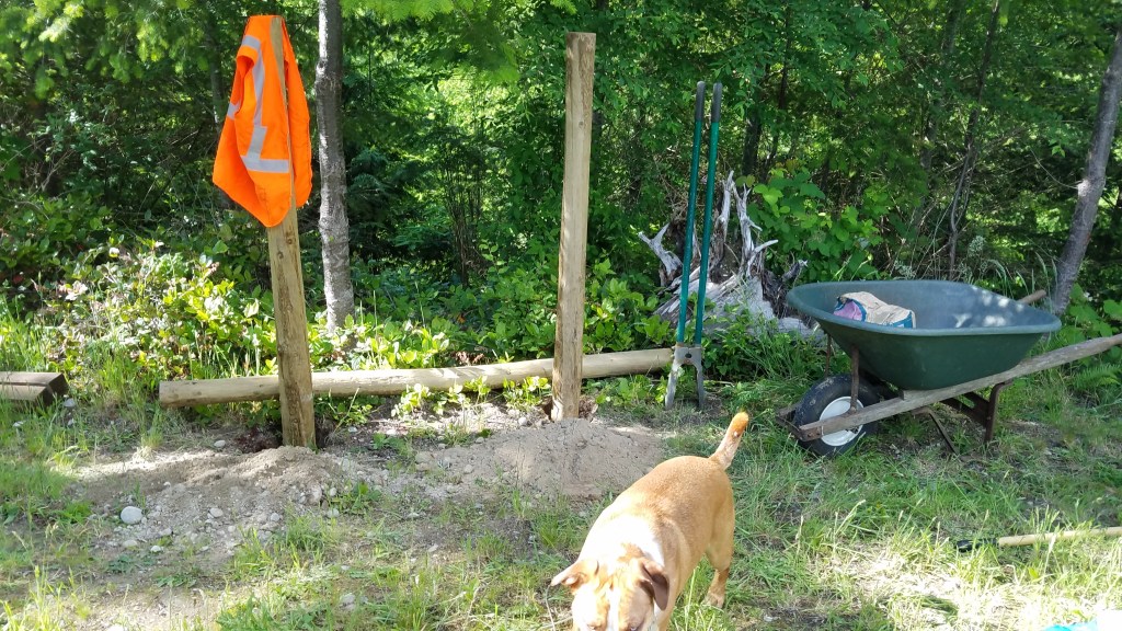 After spending the day Saturday obtaining materials and creating the hardware to fasten the rail to the posts, I loaded up the truck Sunday morning. Judith and I moved the material to the work site and then spent the rest of the day digging holes and erecting the new hitch rail. Our newest canine co-worker, Ruby, was on hand to supervise and has inherited our old dog Tigger’s skills at photobombing.