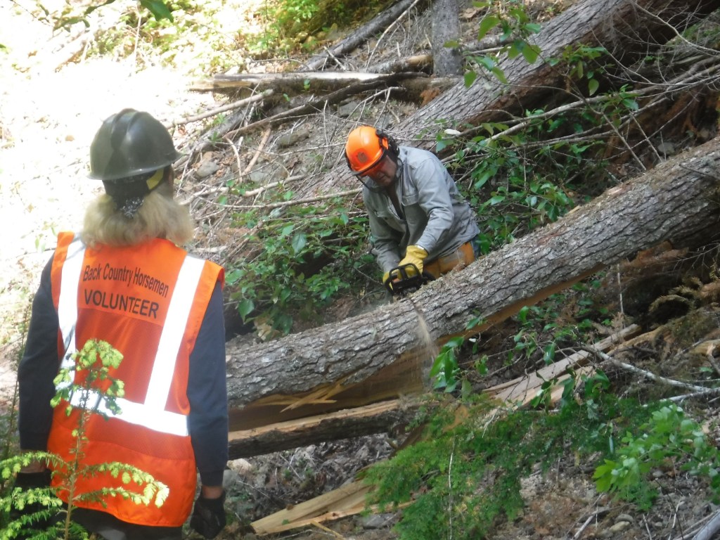A few volunteers came with horses for the purpose of scouting the trail and identifying blocking logs. This was done along with some additional help from local riders. Not only did they identify the blocking logs, but Bob, Jim H (with chain saw), Donna H, and Terry Monroe (with pack horse) went in afterwards on Sunday to cut them out. They opened up the main loop from the horse camp to Camp Comfort and back. (One hanging log was too low to ride under – Bob went back the following Saturday and lowered the tread so a horse can safely pass until it can be removed). Now there is a reason to go back with riding horses to camp.
