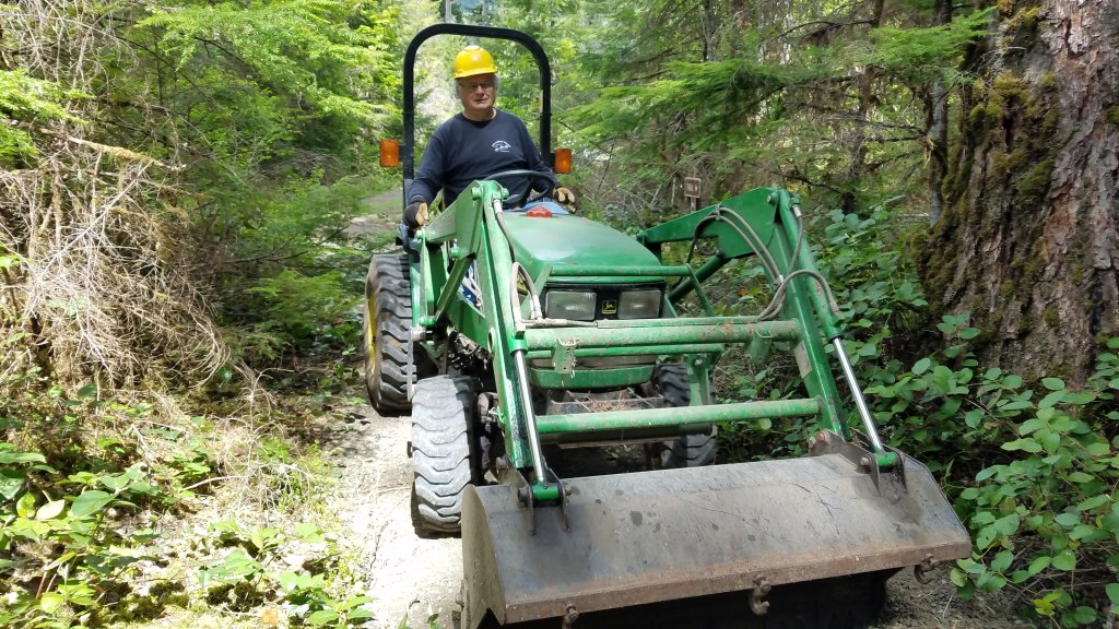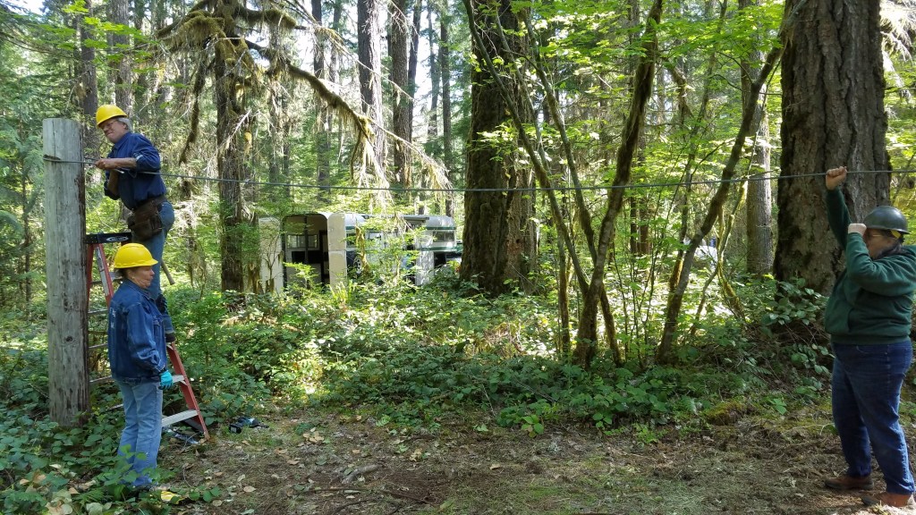 Between Friday and Saturday, we filled the camp up with volunteers. Most all the gravel was spread (except about 5 yards piled saved for later) with Nancy Scott on her Kubota. We had a plan to replace 6 highline cables. In fact, Larry (and crew Kris and Pat) replaced 8. The campground was completely brushed and all sites were spruced up. Campground trails were opened up and graveled. Picnic tables were repaired.