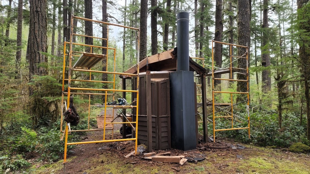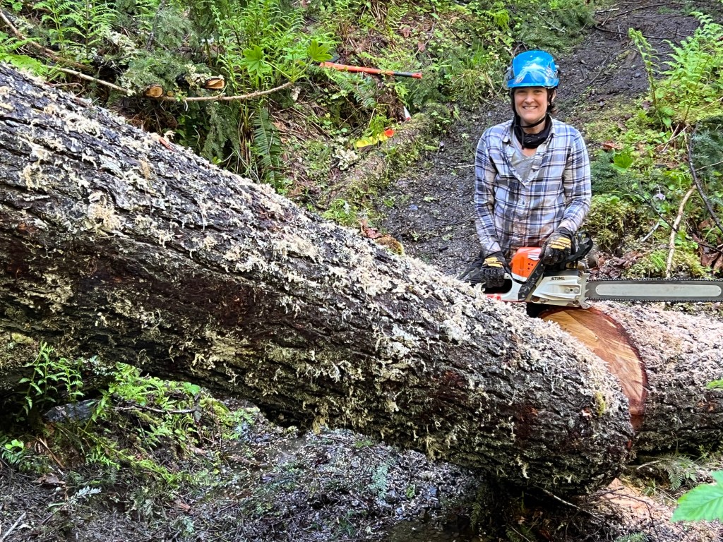 The Regional BCHW work party began Friday May 20th to clean up LeBar Horse Camp and finish logging out the Skok trail as far as the 100. Rebecca ran the sawyer crews made up of WTA sawyers Martin Knowles, Tom Griffith, Tien Vo, Bernt Ericsen, and Paul Hornberger. Peninsula chapter sawyers Jim Hollatz and Rick King, with Suzanne King and Kris Lenke swamping. Harold Weise of Olympic chapter provided pack support for the sawyer crews while Larry Sammons of Buckhorn and I demolished and removed the old rotting roof from the vault toilet in camp in preparation for the new roof.