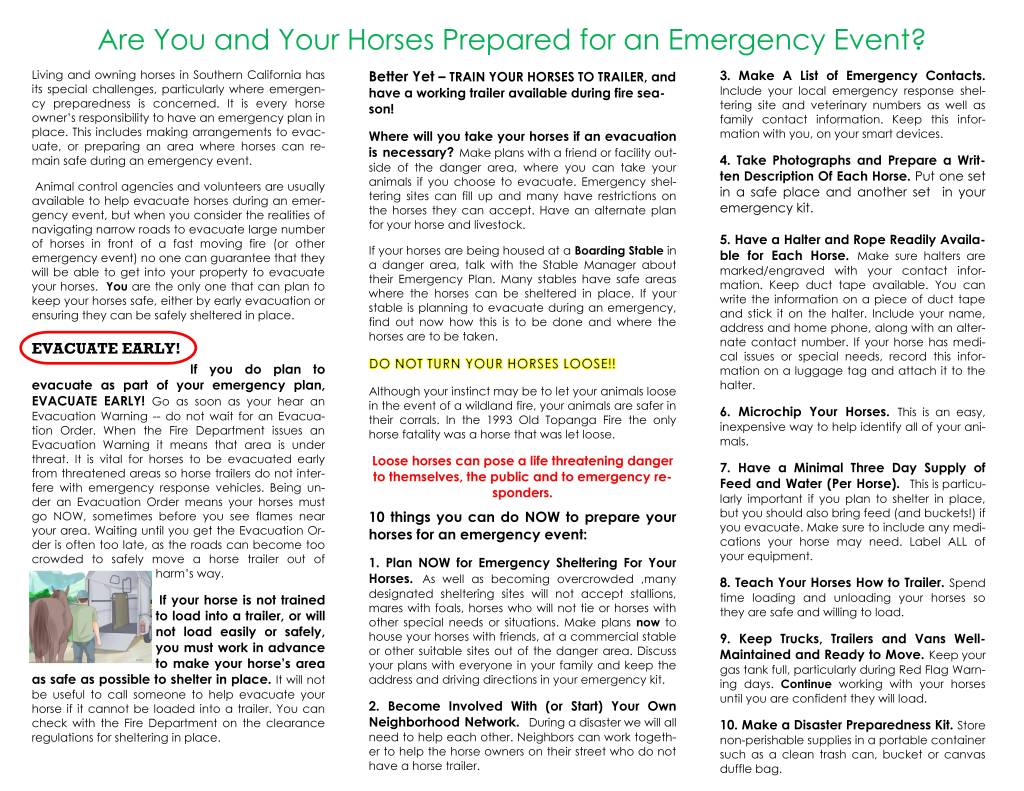 The purpose of this page is to give you some resources to use to help plan for emergencies and natural disasters. This page is a work in progress and will be changing as it is developed, so please check back to see what may have changed. For now, we have posted documents that we hope you find useful, as well as a link to the BCHW Disaster Preparedness for Equine Owners page which has many useful links to further resources.